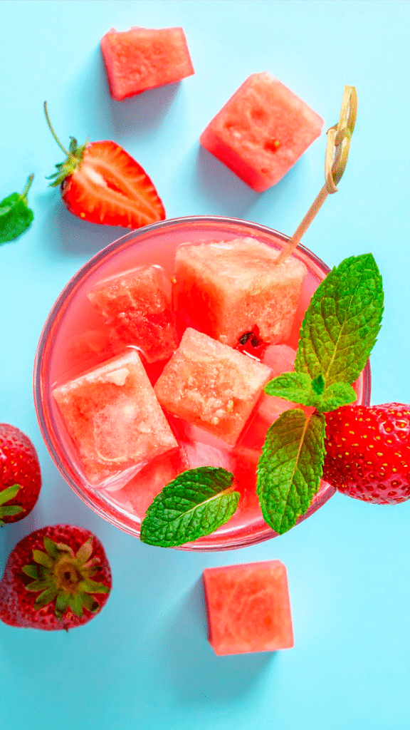 summer punch preparación 30 ml jugo de arándano 10 ml jarabe simple Hielo Decoración: Trozos de sandía y fresa Presentación: Copa balón, color vibrante 120 ml Viña Fresa Sandía